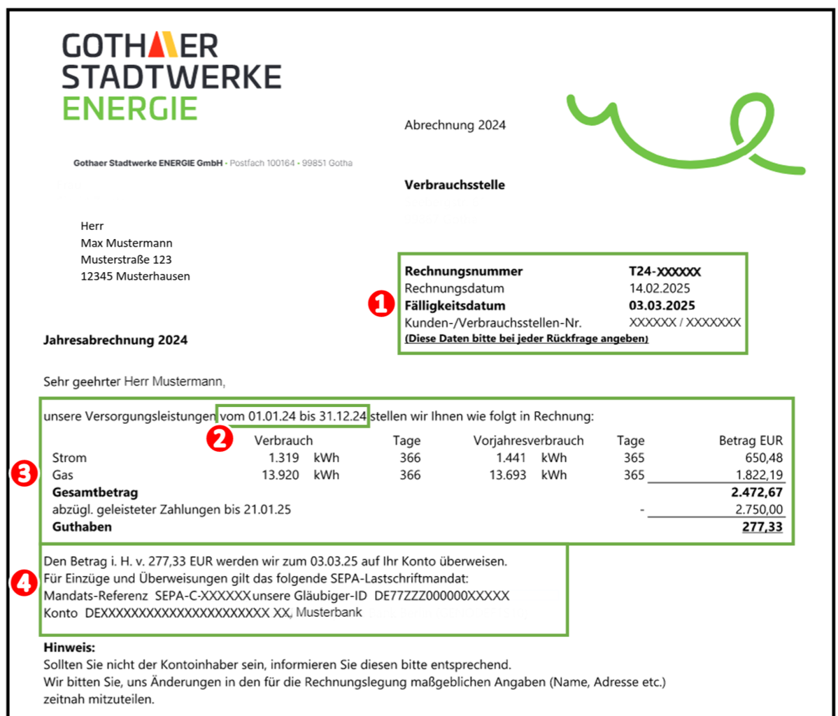 In diesen Tagen erhalten Sie die Jahresrechnung der Gothaer Stadtwerke ENERGIE und erfahren, wie viel Energie Sie im vergangenen Jahr verbraucht haben – und was das kostet. Doch das ist manchmal gar nicht so leicht zu überblicken. Aufgrund der gesetzlichen Rahmenbedingungen aus dem Energiewirtschaftsgesetz enthält die Rechnung viele Informationen und Fachbegriffe. Damit für Sie keine Frage offen bleibt, finden Sie hier Erläuterungen zu den einzelnen Positionen und weitere Online-Services zu Ihrem Vertrag.