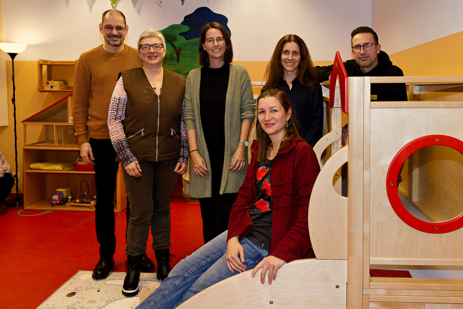Am 30.11.2023 eröffneten Mario Greiner und Ines Leinhos von der Regionalstiftung der Kreissparkasse Gotha sowie Dana Hellmann und Sabine Erlewein der Stadtwerke Gotha GmbH das neugestaltete und hochwertig ausgerüstete Spielzimmer (v.l.n.r.). Darauf warteten die kleinen Gäste des Begegnungscafés bereits sehnsüchtig. Julia Krebs aus der Geschäftsleitung des Gothaer Mehrgenerationenhauses (vorne) und ihr Kollege Sven Noll (r.) freuten sich.