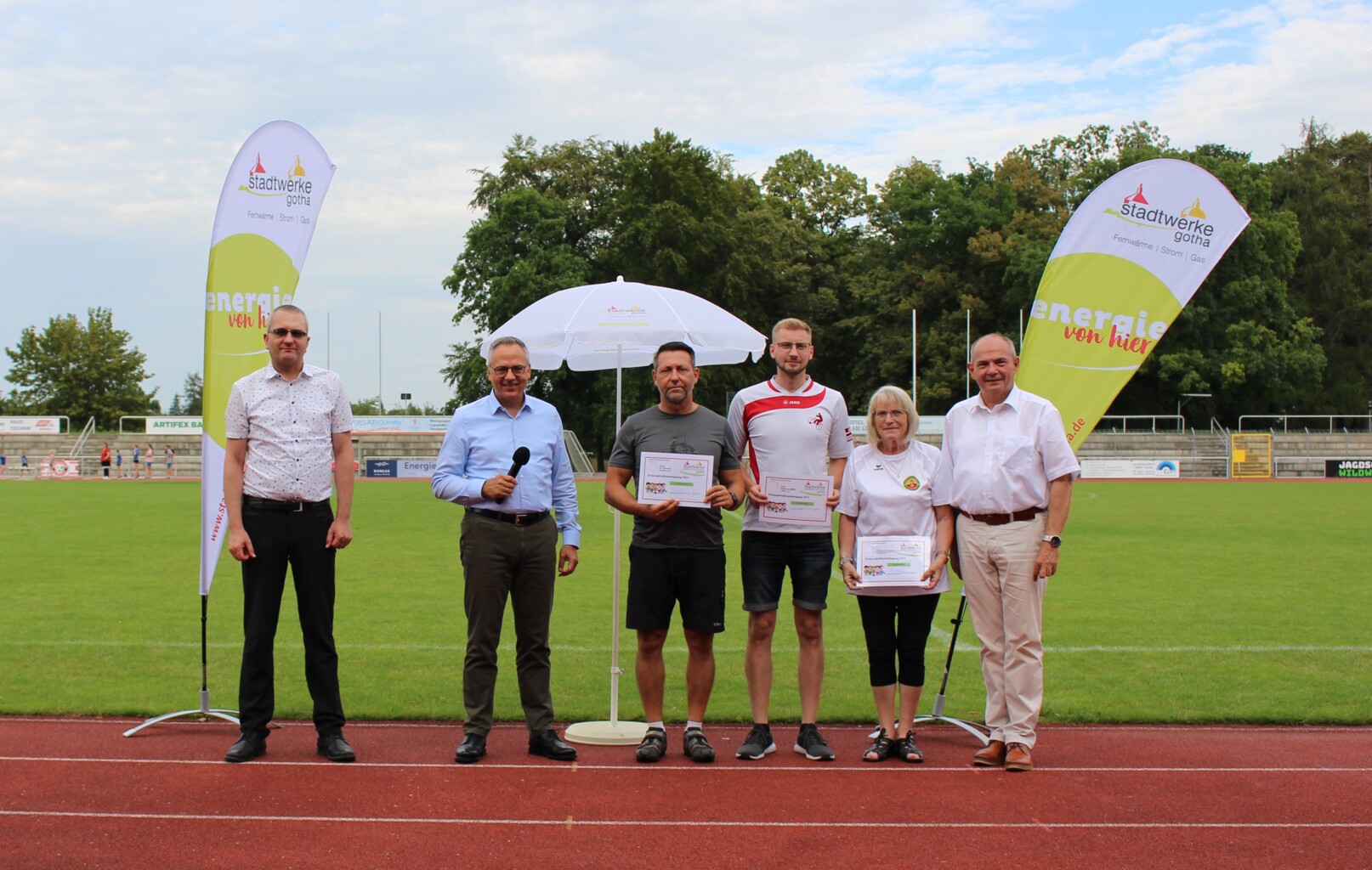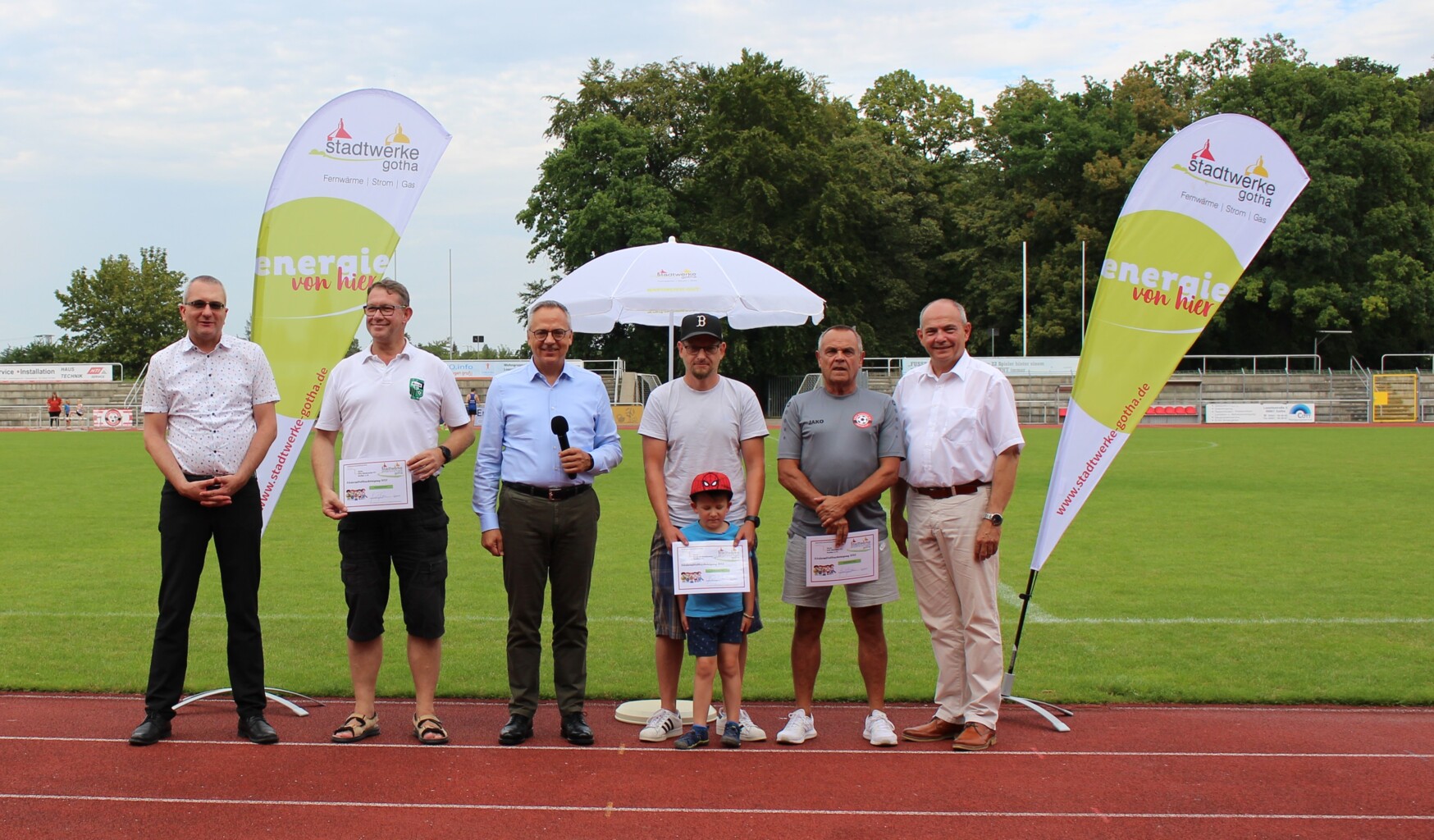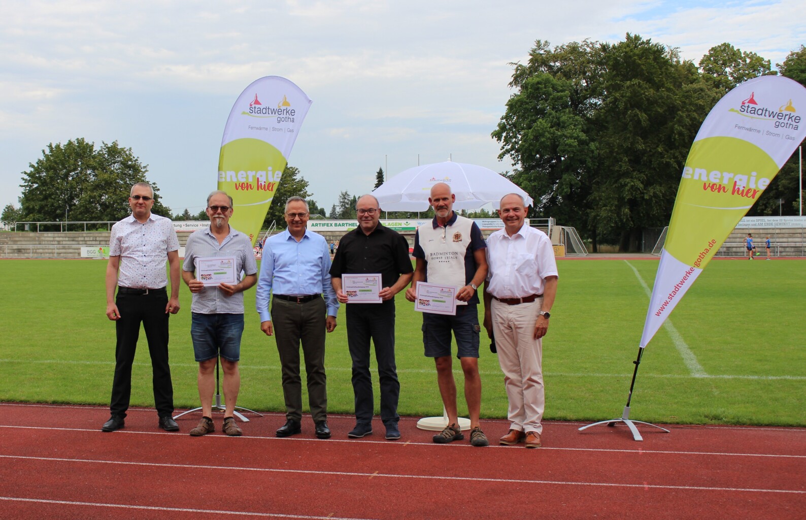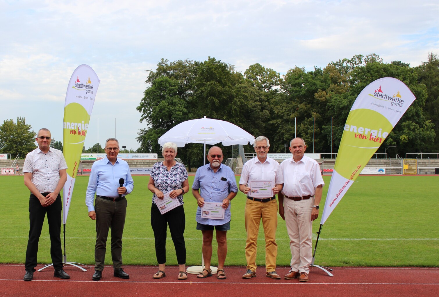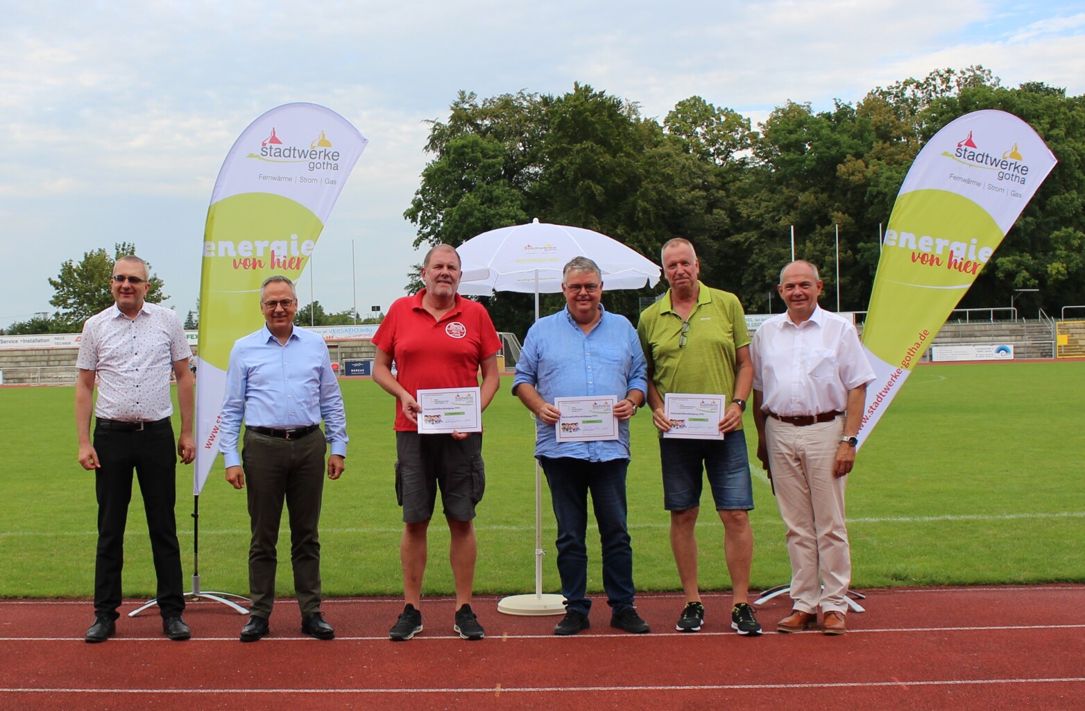 Grund zur Freude hatten insgesamt 31 regionale Sportvereine: Die Stadtwerke Sportstiftung Gotha hat Vertreterinnen und Vertretern der Vereine im Gothaer Volkspark-Stadion offiziell die diesjährigen symbolischen Schecks übergeben. Die sportlichen Einrichtungen erhielten damit Fördergelder in der Gesamtsumme von 49.992 Euro – persönlich überreicht von Knut Kreuch, Oberbürgermeister der Stadt Gotha und Vorstandsvorsitzender der Stadtwerke Sportstiftung Gotha, und Dirk Gabriel, Geschäftsführer der Stadtwerke Gotha GmbH, sowie Dr. Andreas Roß, Mitglied des Vorstandes der TEAG Thüringer Energie AG. „Das ist ein guter Tag für den regionalen Sport. Wir freuen uns, die Vereinslandschaft in Gotha mit dem Wirken der Sportstiftung unterstützen zu können“, sagte Oberbürgermeister Knut Kreuch bei der Übergabe. Dirk Gabriel ergänzte: „Breitensport ist nicht nur wichtig für die Gesundheit, er ist ein Ort für Gemeinschaften und fördert Zusammenhalt.“