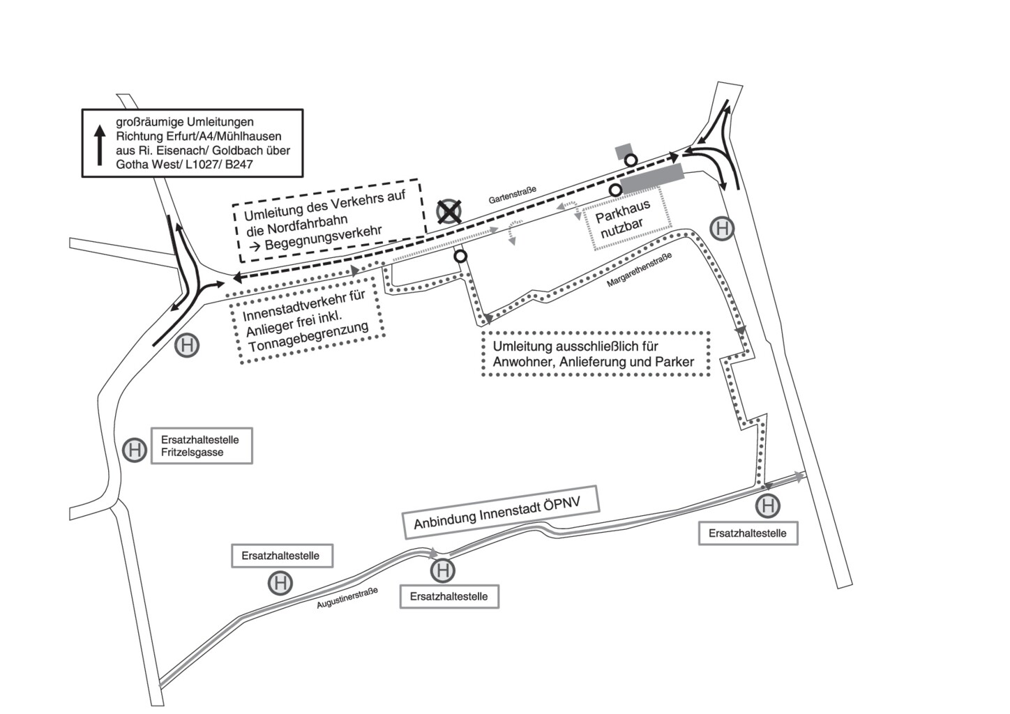 Die Gartenstraße wird weiterhin in beiden Richtungen befahrbar sein. Allerdings werden die beiden südlichen Fahrbahnen für den allgemeinen Verkehr gesperrt. Da der Baubeginn später als geplant stattfindet, erfolgt die ursprünglich für August vorgesehene Versorgungsunterbrechung nun zwischen dem 4. September und dem 9. September. Die betroffenen Fernwärmekunden im östlichen Teil der Innenstadt werden direkt von den Stadtwerken Gotha informiert.