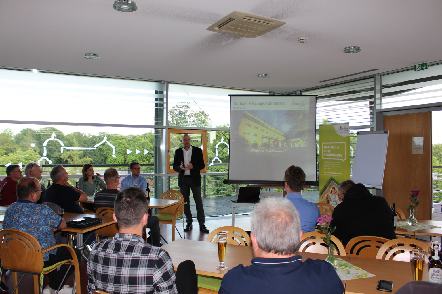Sven Anders, Geschäftsführer der Stadtwerke Gotha GmbH, sprach zu den Herausforderungen der Energieversorgung, der Rolle der Stadtwerke bei der kommunalen Wärmeplanung, zu PV-Anlagen und Elektromobilität in Gotha. „Wir unterstützen die Stadt bei der kommunalen Wärmeplanung. Wir bauen unser Fernwärmenetz weiter aus, um die umweltschonende Energieversorgung der Stadt voranzutreiben. Viele Unternehmen in Gotha beziehen von uns Strom, Gas und Wärme und nutzen unsere Energiedienstleistungen“, erklärt Sven Anders. Im Anschluss an seinen Impulsvortrag tauschten sich die Teilnehmenden in den Räumlichkeiten der Stadtwerke Gotha aus.