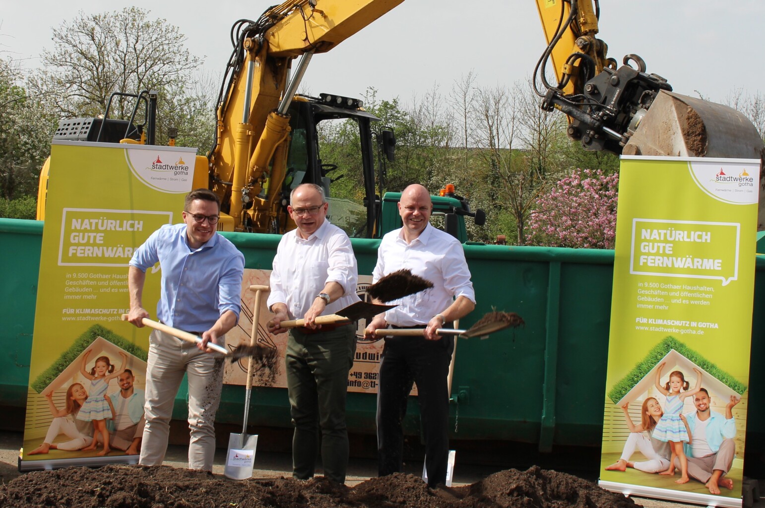 An die Spaten, fertig, los: Am Montag, 8. April, hat Gothas Oberbürgermeister Knut Kreuch zusammen mit Sven Anders, Geschäftsführer der Stadtwerke Gotha, und seinem Bereichsleiter Erzeugung und Wärme, Ferdinand von Stryk, die Ärmel hochgekrempelt. Mit einem kräftigen Spatenstich haben sie gegenüber dem bestehenden Heizkraftwerk Ost den symbolischen Startschuss für den Bau einer innovativen Kraft-Wärme-Kopplungsanlage (iKWK) gegeben. Mit diesem Projekt läuten die Stadtwerke Gotha auch gleichzeitig den Beginn der Dekarbonisierung ihrer Fernwärme ein. Schrittweise soll die Wärmeerzeugung auf erneuerbare Energien umgestellt werden.