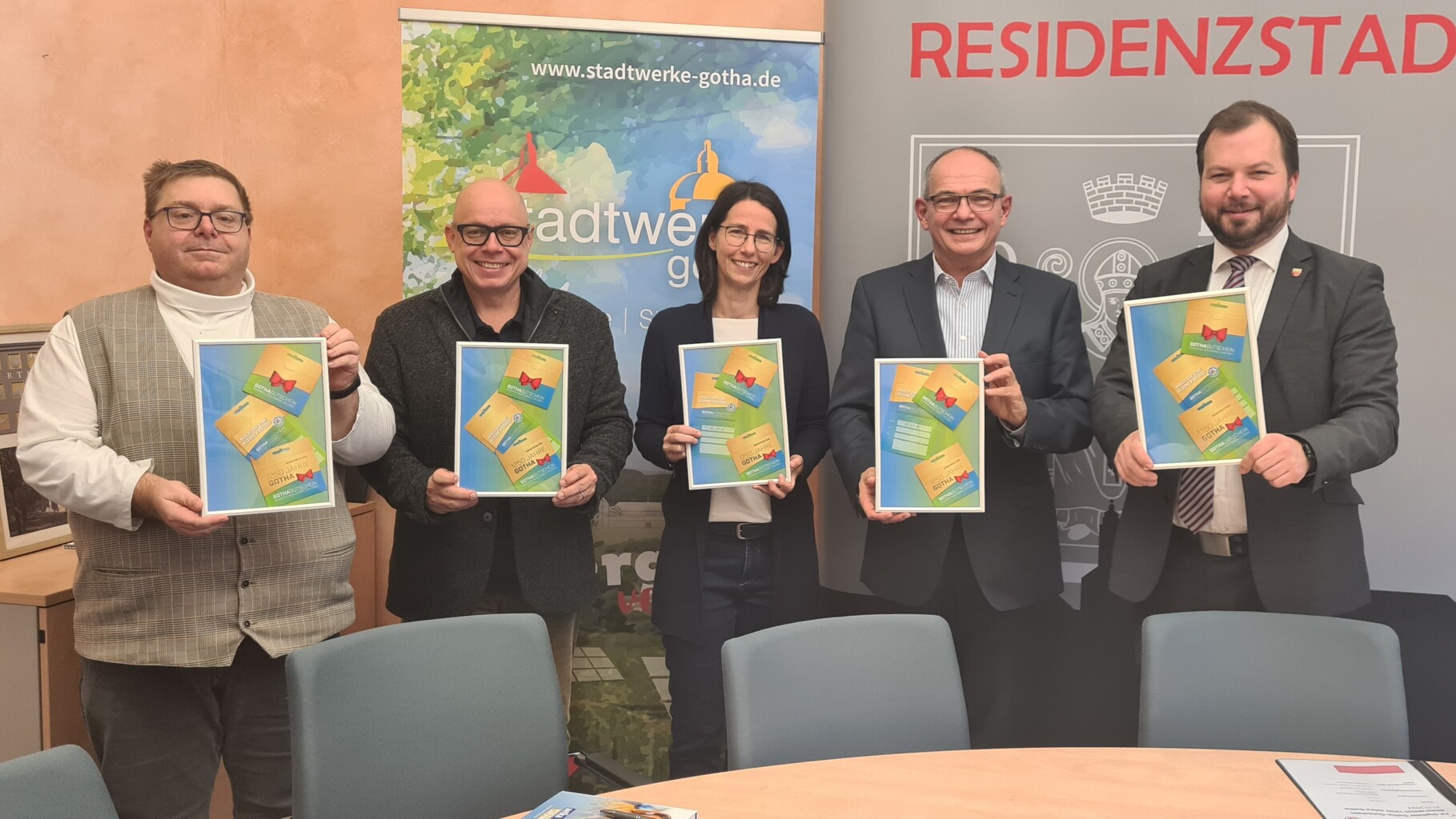 Foto v.l.n.r.: Andreas Dötsch (Gewerbeverein), Enrico Heß (KulTourStadt Gotha), Dana Hellmann (Stadtwerke Gotha), OB Knut Kreuch und Landrat Onno Eckert