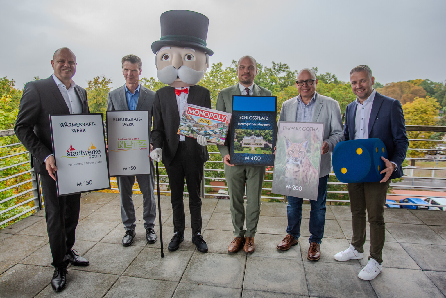 Foto 2 v. l. n. r. : Sven Anders, Geschäftsführer der Stadtwerke Gotha GmbH; Detlef Mölter, Geschäftsführer Stadtwerke Gotha Netz GmbH; Mister Monopoly; Peter Leisner, hauptamtlicher Beigeordneter für Finanzen und Bildung der Stadt Gotha; Enrico Heß, Geschäftsführer der KulTourStadt Gotha GmbH; Florian Freitag, geschäftsführender Gesellschafter der Polar1 GmbH